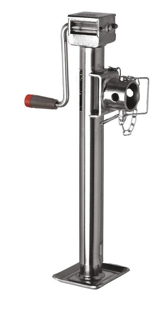 Pied de support Simol avec manivelle verticale et bride assortie – Capacité : 1 300 kg. Convient pour voitures ou remorques agricoles.